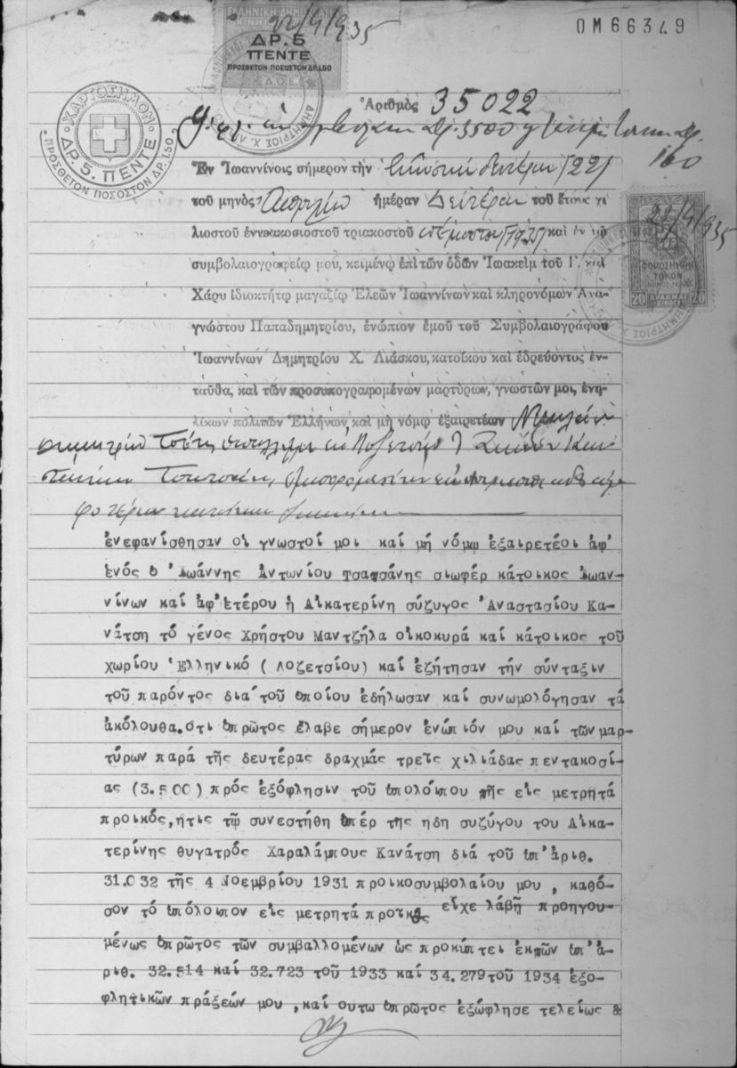 [Τεκμήριο] GRGSA-IAE_NOT002.01.F000103.IT035022 Τεκμήριο #35022 [22 Απριλίου 1935] Συμβολαιογραφική πράξη. Εξόφληση εκ συμβολαίου και τεκμαρτών τόκων. |