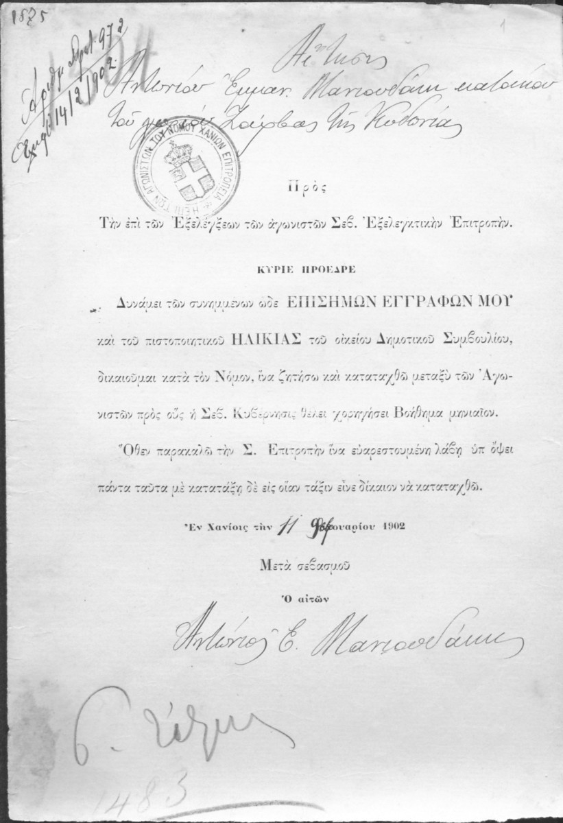 [Subfile] GRGSA-IAK_AGO012.01.F000007.SF1504 Subfile #1504 [1902] Αιτήσεις - πιστοποιητικά αγωνιστών, χηρών - ορφανών του Νομού Χανίων προς την Επιτροπή αγωνιστών. |