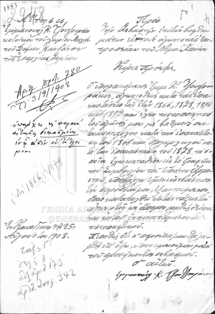 [Subfile] GRGSA-IAK_AGO012.01.F000014.SF2948 Subfile #2948 [1908] Αιτήσεις - πιστοποιητικά αγωνιστών, χηρών - ορφανών του Νομού Χανίων προς την Επιτροπή αγωνιστών. |