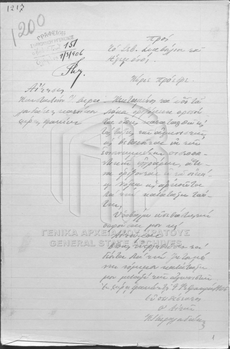 [Υποφάκελος] GRGSA-IAK_AGO012.01.F000024.SF1200 Υποφάκελος #1200 [1906] Αιτήσεις - πιστοποιητικά αγωνιστών, χηρών - ορφανών της Επαρχίας Σφακίων προς την Επιτροπή αγωνιστών. |