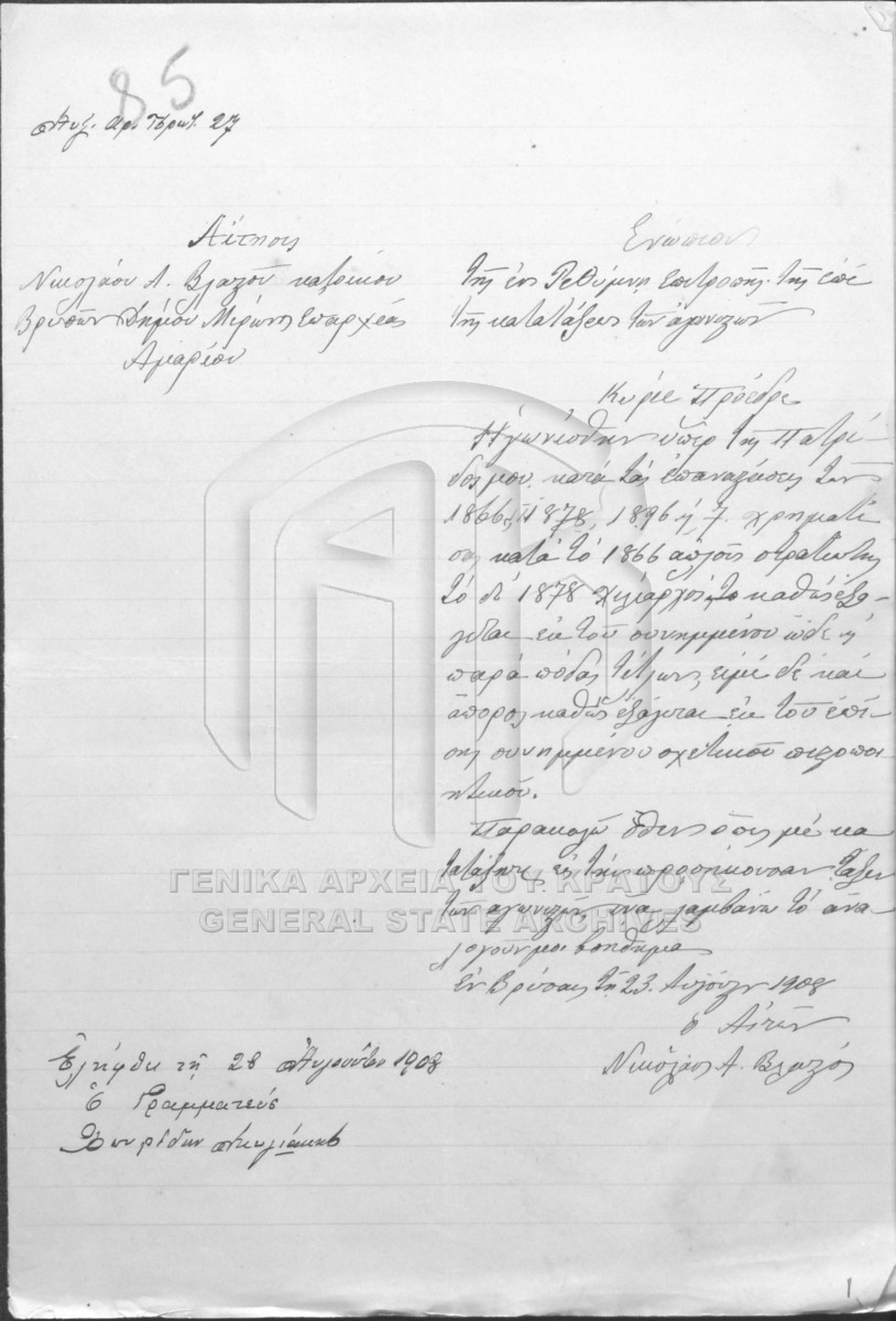 [Subfile] GRGSA-IAK_AGO012.01.F000029.SF0085 Subfile #085 [1908] Αιτήσεις - πιστοποιητικά αγωνιστών, χηρών - ορφανών του Νομού Ρεθύμνου προς την Επιτροπή αγωνιστών. |