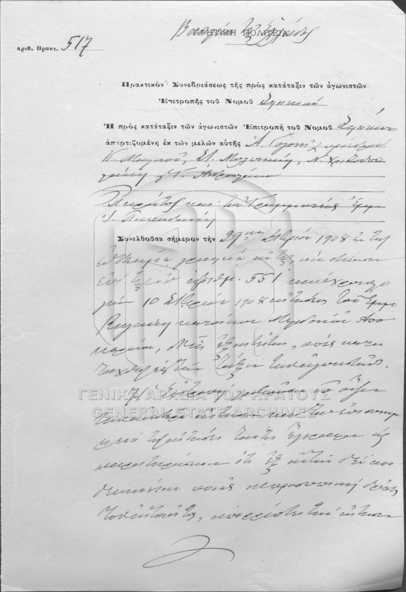 [Υποφάκελος] GRGSA-IAK_AGO012.01.F00PR45.SF0517 Υποφάκελος #517 [1908] Πρακτικά συνεδριάσεων της Επιτροπής αγωνιστών της Επαρχίας Σφακίων. |