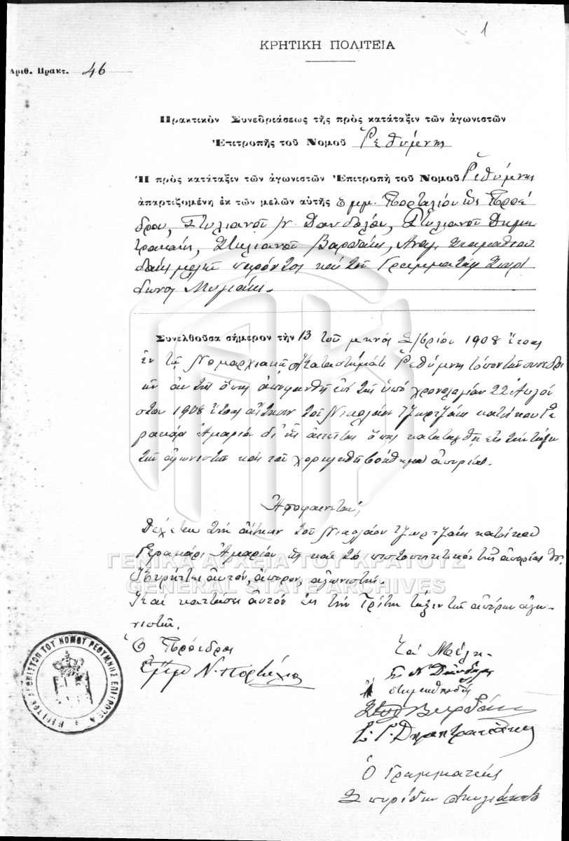 [Υποφάκελος] GRGSA-IAK_AGO012.01.F000053.SF0046 Υποφάκελος #046 [1908] Πρακτικά αποφάσεων αγωνιστών Νομού Χανίων. |