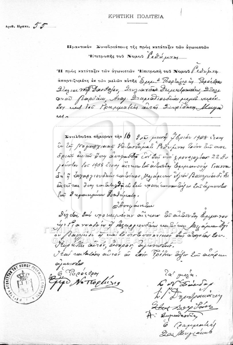 [Υποφάκελος] GRGSA-IAK_AGO012.01.F000053.SF0055 Υποφάκελος #055 [1908] Πρακτικά αποφάσεων αγωνιστών Νομού Χανίων. |