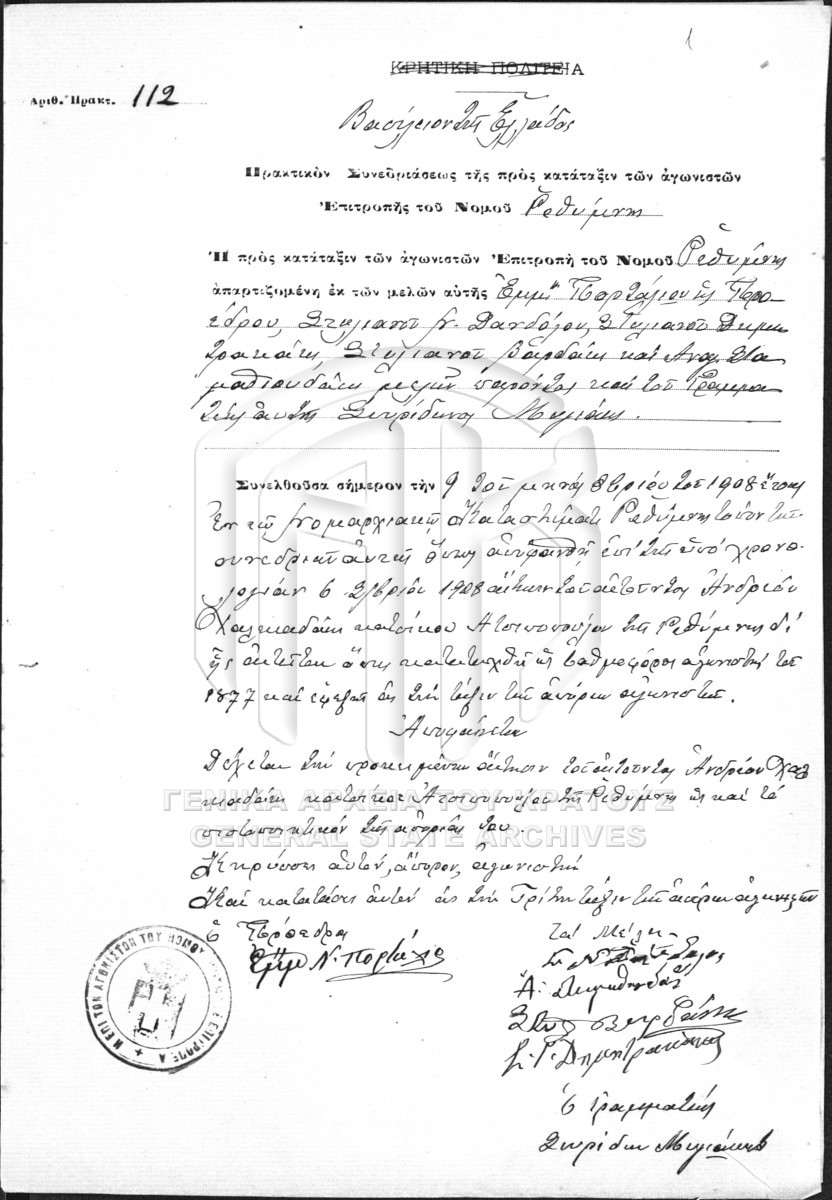[Subfile] GRGSA-IAK_AGO012.01.F000053.SF0112 Subfile #112 [1908] Πρακτικά αποφάσεων αγωνιστών Νομού Χανίων. |