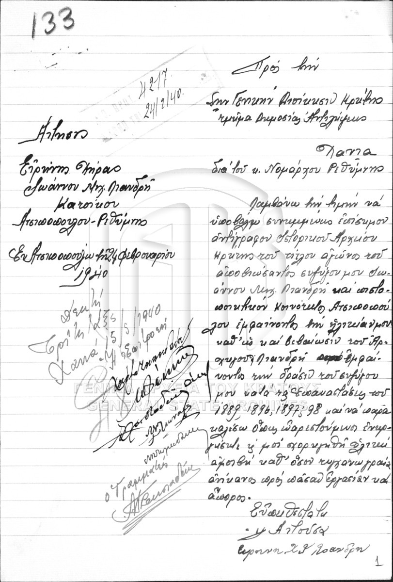 [Subfile] GRGSA-IAK_AGO012.01.F000073.SF0133 Subfile #133 [1940] Αιτήσεις - πιστοποιητικά αγωνιστών, χηρών - ορφανών προς την Επιτροπή αγωνιστών. |