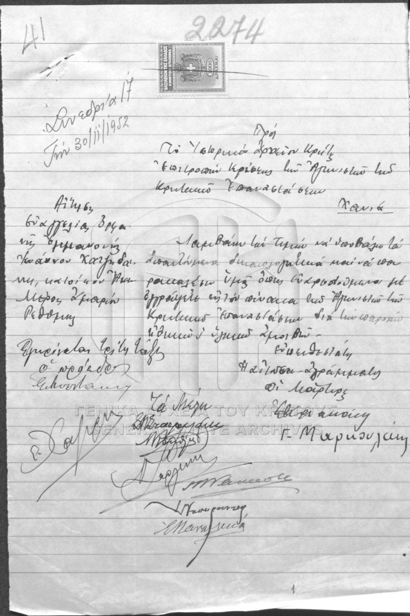 [Item] GRGSA-IAK_AGO012.01.F000084.SF0001.IT2274 Item #2274 [1952] Αιτήσεις - πιστοποιητικά αγωνιστών, χηρών - ορφανών προς την Επιτροπή αγωνιστών. |