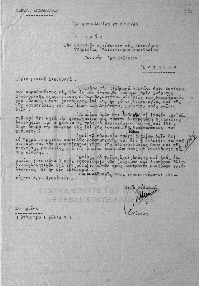 Contents: Έγγραφα της Α.Υ.Ε.Μ. Εκθέσεις ελεγκτών για τη λειτουργία διαφόρων τμημάτων Α.Υ.Ε.Μ. Υ. Γενικές διαταγές, εσωτερικά έγγρα...