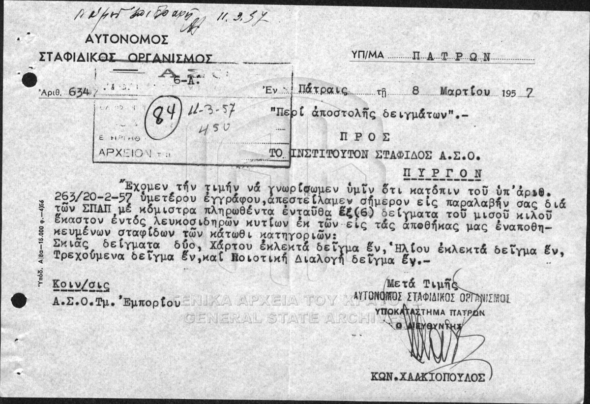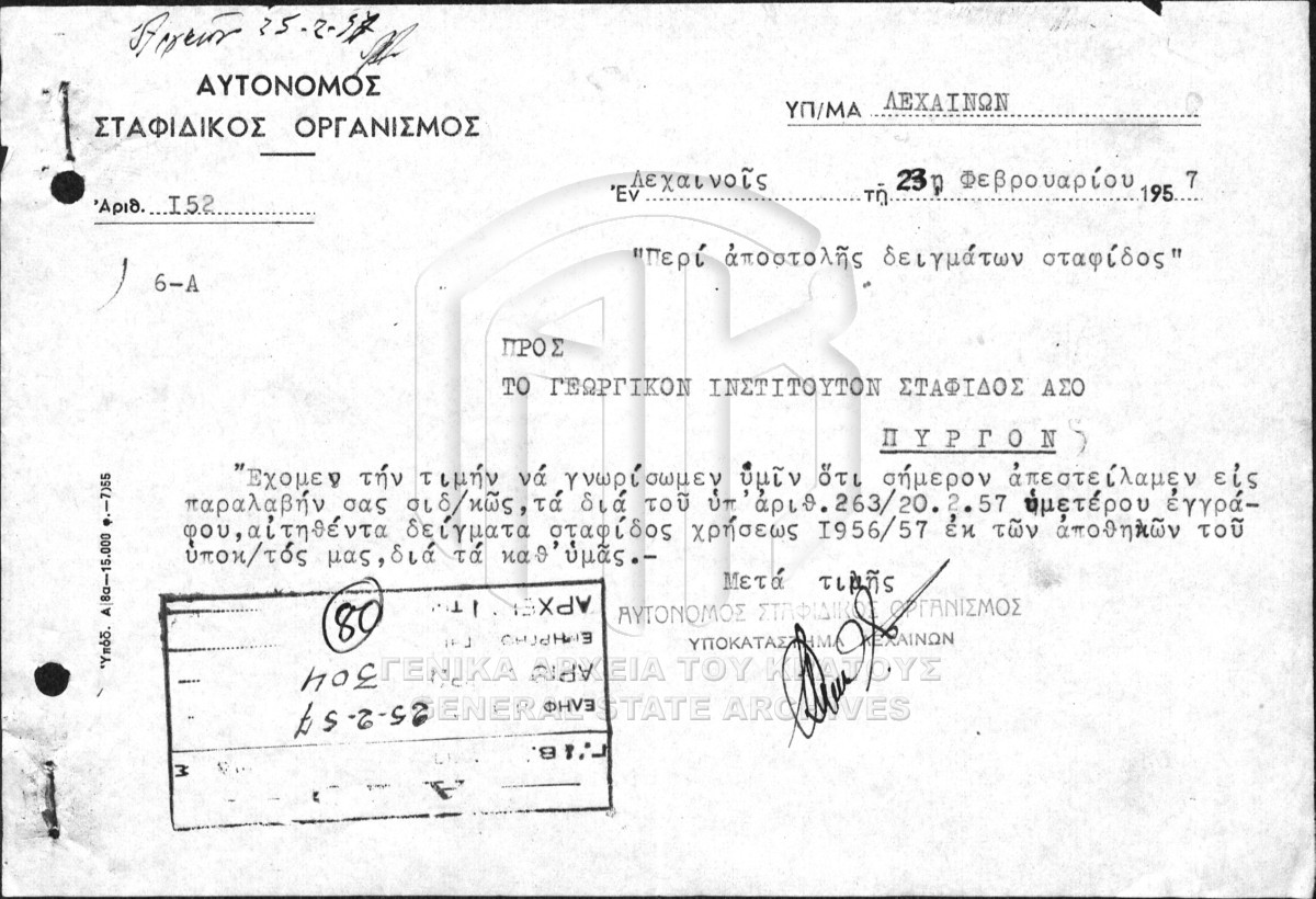 [Subfile] GRGSA-ILE_ADM007.01.F000018.SF0023 Subfile #023 - ΙΝΣΤΙΤΟΥΤΟ ΣΤΑΦΙΔΑΣ / ΦΑΙΝΟΛΟΓΙΚΑ [1953 - 1958] Σχετικά με την αποστολή δειγμάτων σταφίδας και διάφορα πειράματα. |