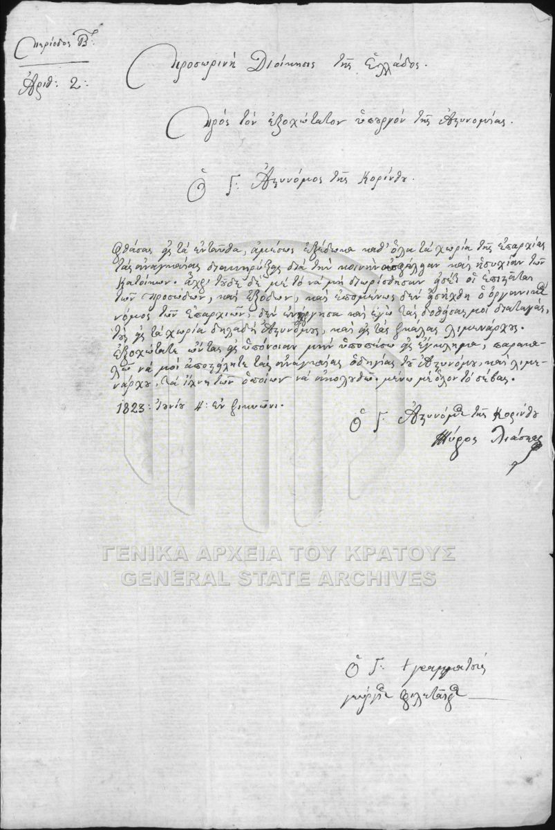 [Αρχείο] GRGSA-CSA_PAA010.00 Αρχείο Μινιστέριου/Γραμματείας/Υπουργείου της Αστυνομίας (περιόδου Αγώνος) [1822 - 1826] Περιέχει επιστολές, επίσημη αλληλογραφία και διάφορα έγγραφα. |