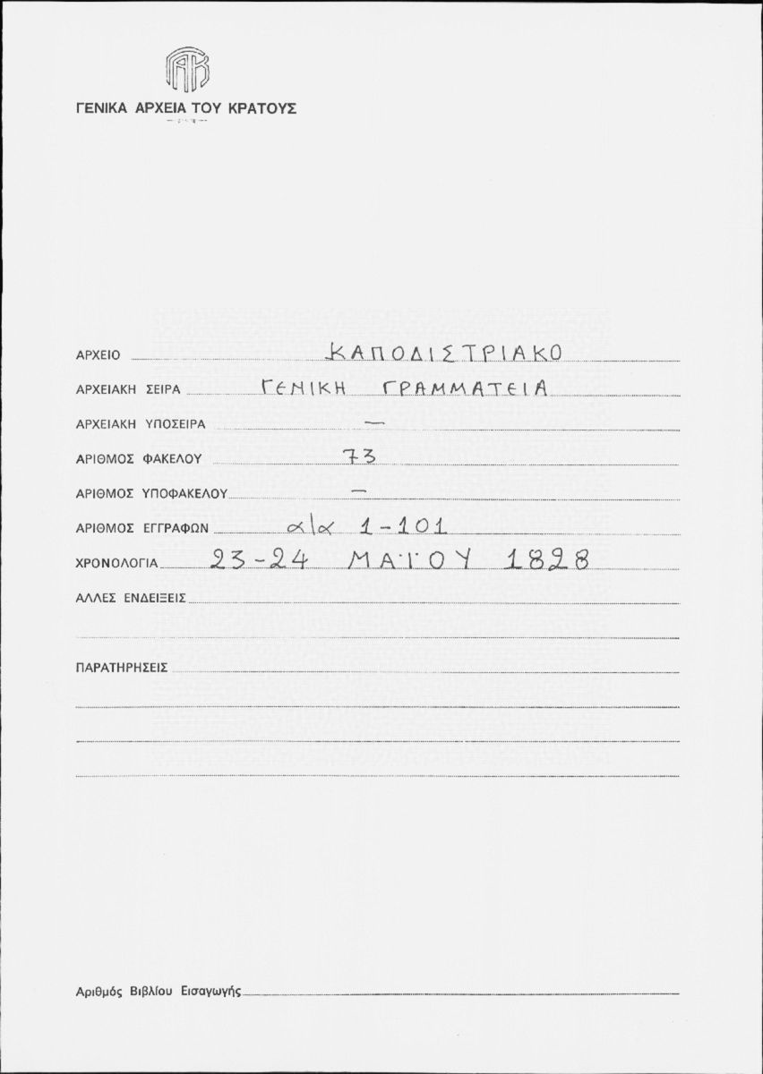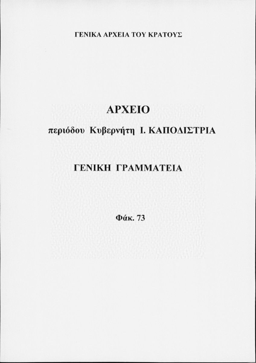 [Φάκελος] GRGSA-CSA_PAK001.00.F000073 Φάκελος #073 - Γενική Γραμματεία [1828] Επιστολές και υπηρεσιακά έγγραφα. |