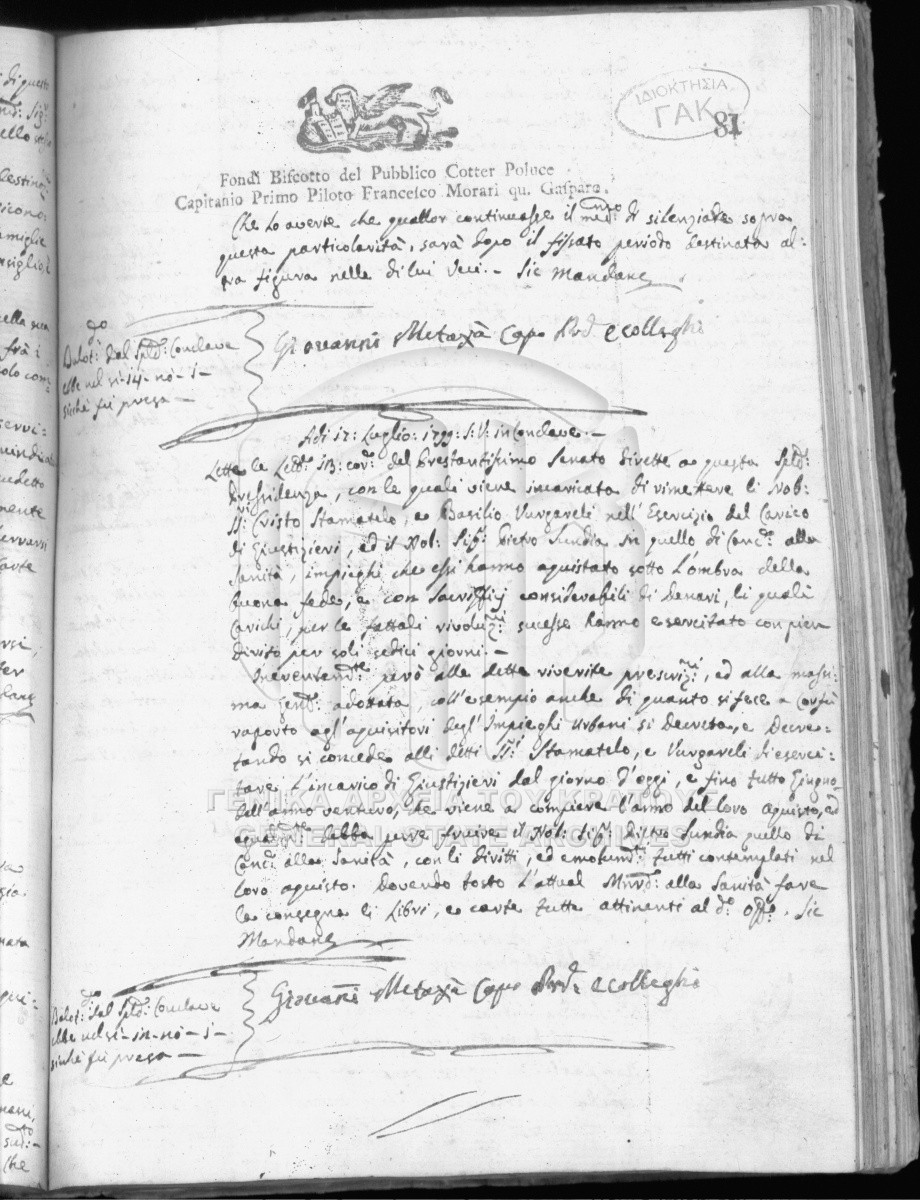Contents: Βιβλίον περιέχον Δουκικάς Διαταγάς, Διατάγματα, Προκηρύξεις, Επίσημα γράμματα και άλλα έγγραφα επί διοικητού Αντωνίου Κό...