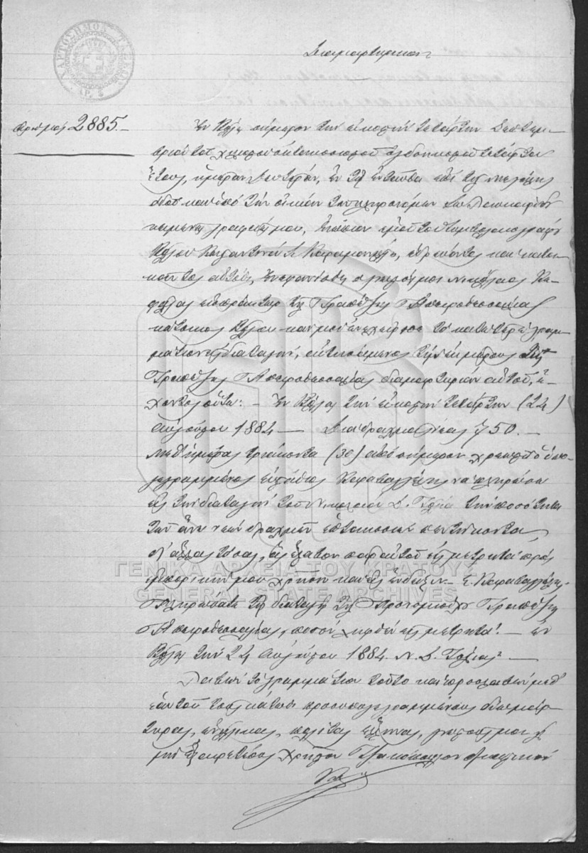 [Item] GRGSA-MAG_NOT002.01.F000007.IT002885 Item #2885 - KARAMANOLIS NOTARIAL ARCHIVE [24 Σεπτεμβρίου 1884] Notarial deed. Notice of protest. |
