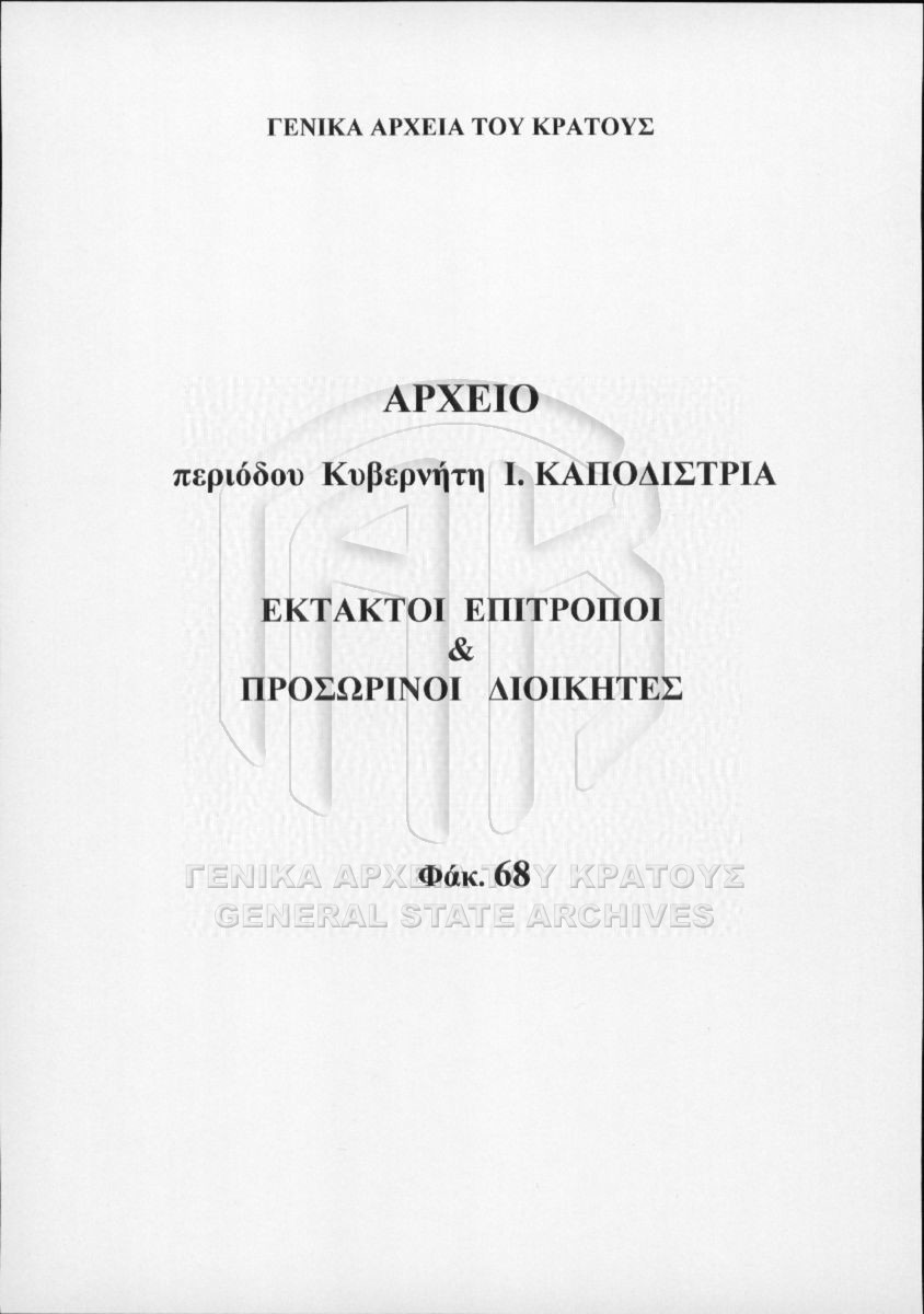 [Fonds] GRGSA-CSA_PAK003.00 Archive of Substitute Delegates and Interim Governors - Archive of Substitute Delegates and Interim Governors [1828 - 1833] Περιέχει επιστολές, λογαριασμούς, διατάξεις, ναυτιλιακά έγγραφα, αποδείξεις και διάφορα έγγραφα. |