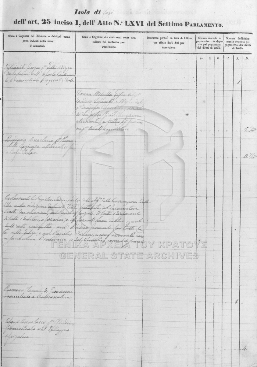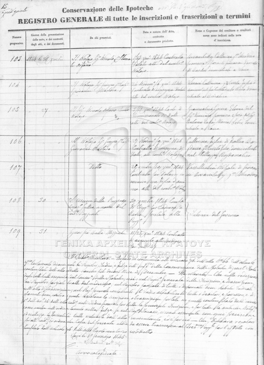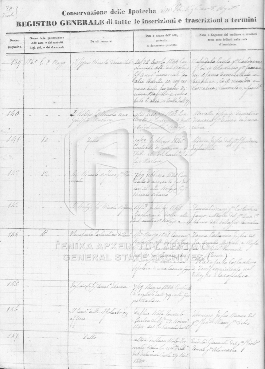 Contents: "Conservatione delle Ipoteche Registro Generale di tutte le inscrizioni e traserizioni a…". Γενικόν Υπόμνημα των εγγραφώ...
