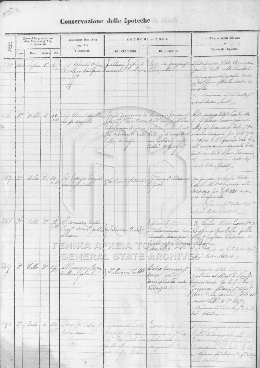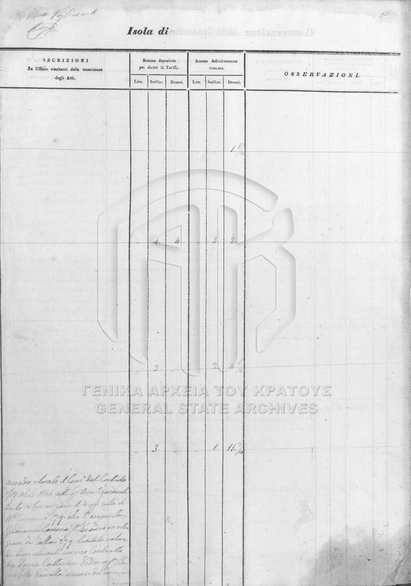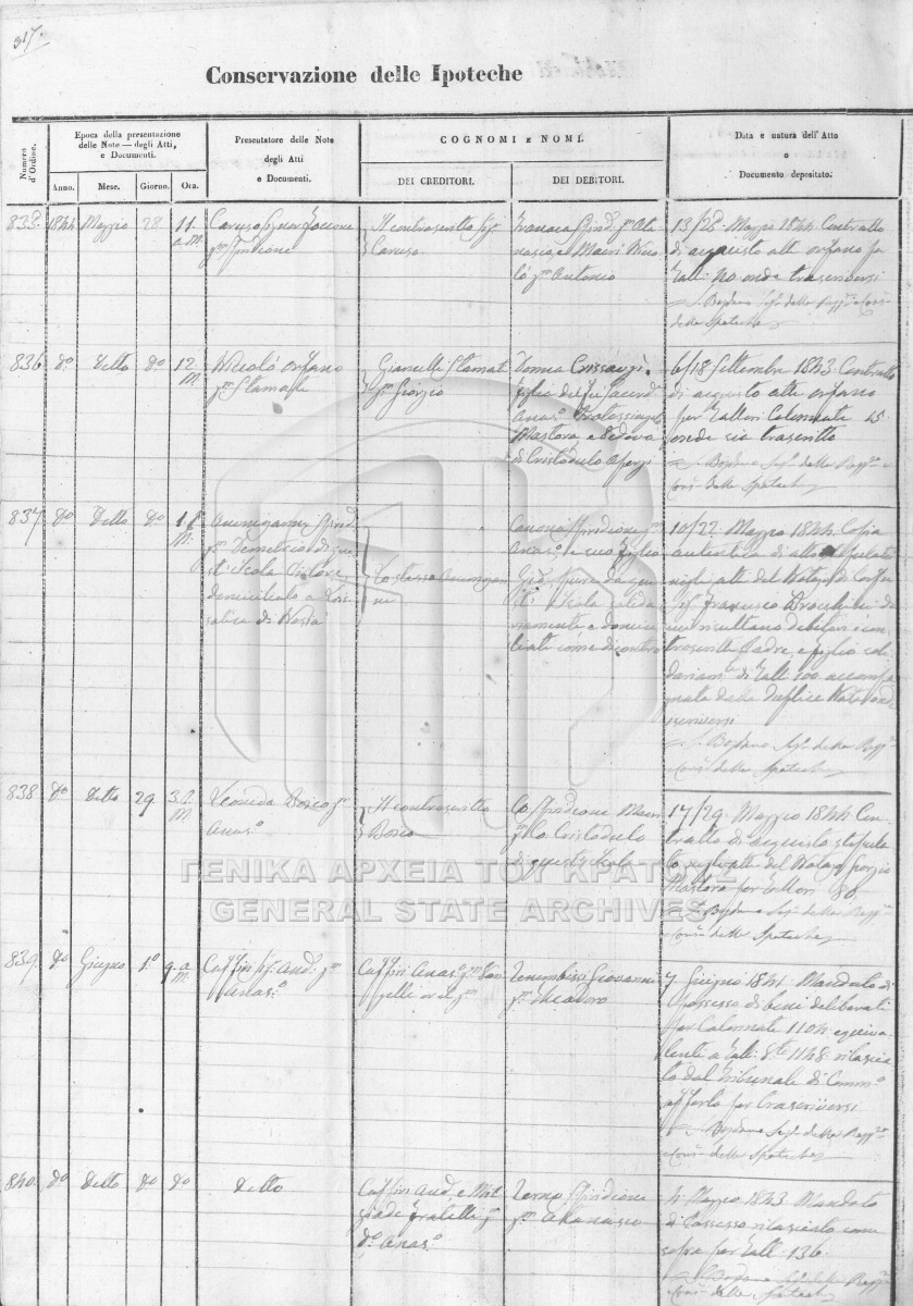 Contents: "Conservatione delle Ipoteche Registro Generale di tutte le inscrizioni e traserizioni a…". Γενικόν Υπόμνημα των εγγραφώ...