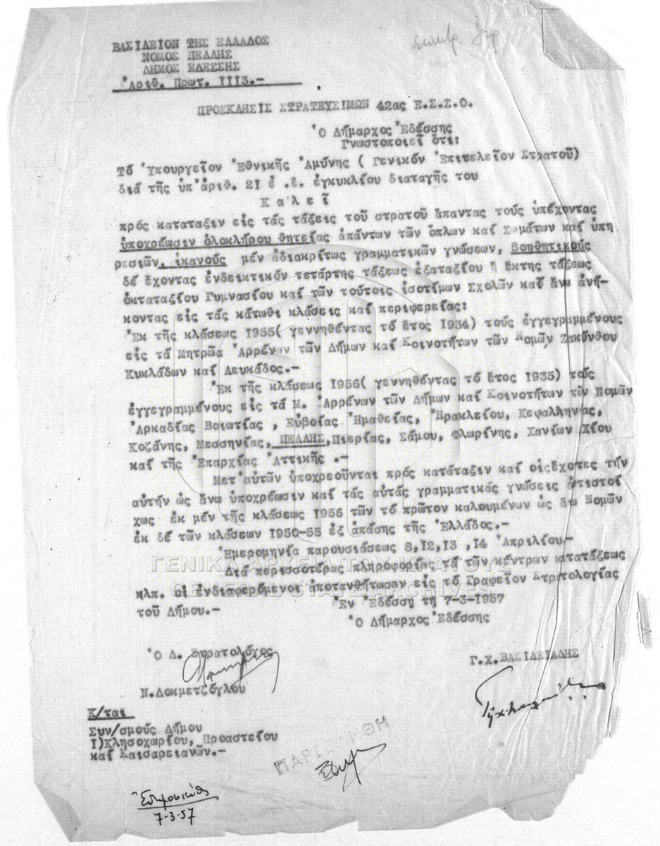 [Fichier] GRGSA-PEL_MUN001.01.F000183 Fichier #183 [1956 - 1959] Στρατιωτικές εγκύκλιοι - Αποφάσεις - Προκηρύξεις διαγωνισμών. |