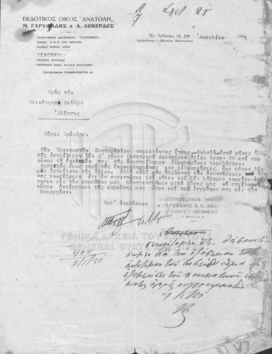 [Φάκελος] GRGSA-PEL_MUN003.01.F000005 Φάκελος #005 [1928 - 1931] Έντυπα επιχειρήσεων με σχετική αλληλογραφία. |