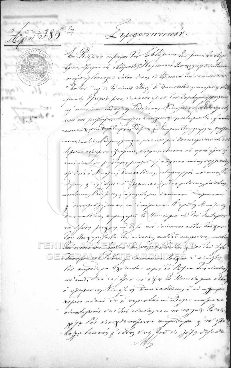 [Τεκμήριο] GRGSA-RET_NOT010.01.F000001.IT000386 Τεκμήριο #386 [7 Σεπτεμβρίου 1886] Συμβολαιογραφική πράξη. Συμφωνητικό. |