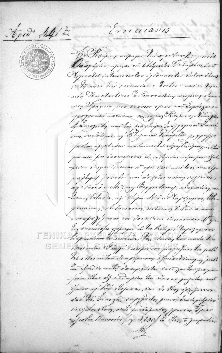 [Item] GRGSA-RET_NOT010.01.F000001.IT000441 Item #441 [1 Οκτωβρίου 1886] Notarial deed. Lease. |