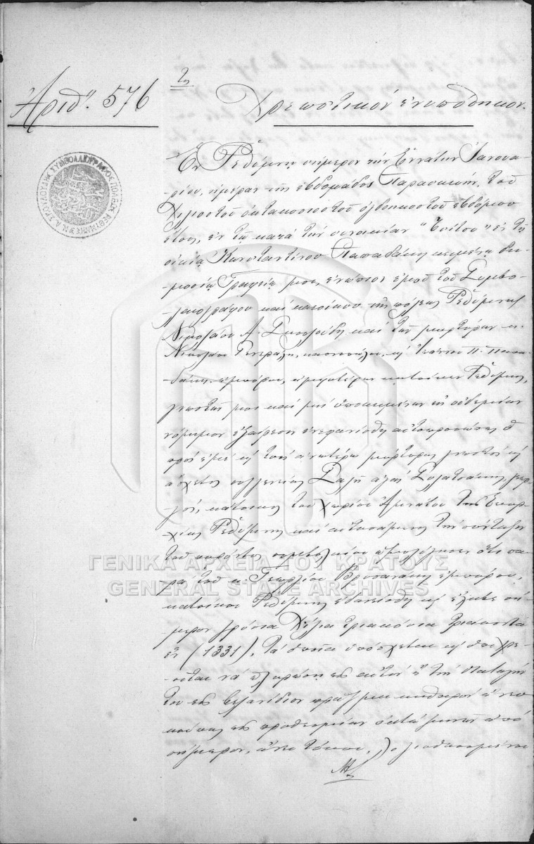 [Τεκμήριο] GRGSA-RET_NOT010.01.F000002.IT000576 Τεκμήριο #576 [9 Ιανουαρίου 1887] Συμβολαιογραφική πράξη. Χρεωστικό ενυπόθηκο. |
