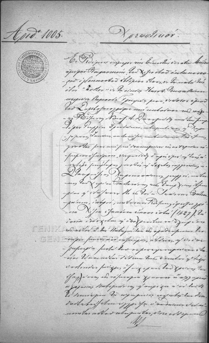 [Τεκμήριο] GRGSA-RET_NOT010.01.F000003.IT001005 Τεκμήριο #1005 [29 Μαΐου 1887] Συμβολαιογραφική πράξη. Χρεωστικό. |