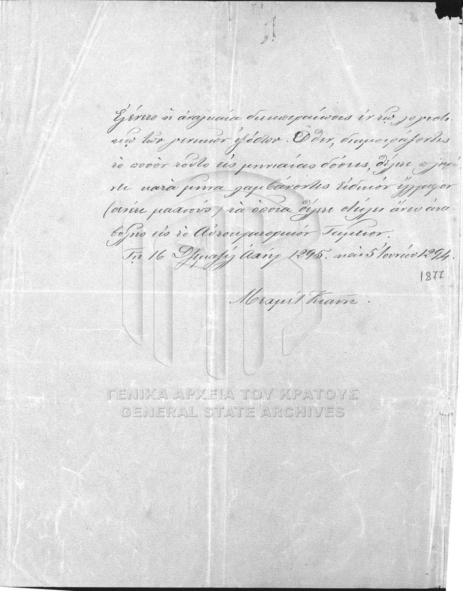 [Item] GRGSA-SAM_COL013.01.F000001.SF0002.IT000052 Item #052 - COLLECTIONS. FOLDER D4. DIRECTORY OF OTTOMAN DOCUMENTS (1790-1889) [5 Ιουνίου 1877] Receipt for amounts in lieu of royal tax paid to ottoman captains, officers, soldiers. |
