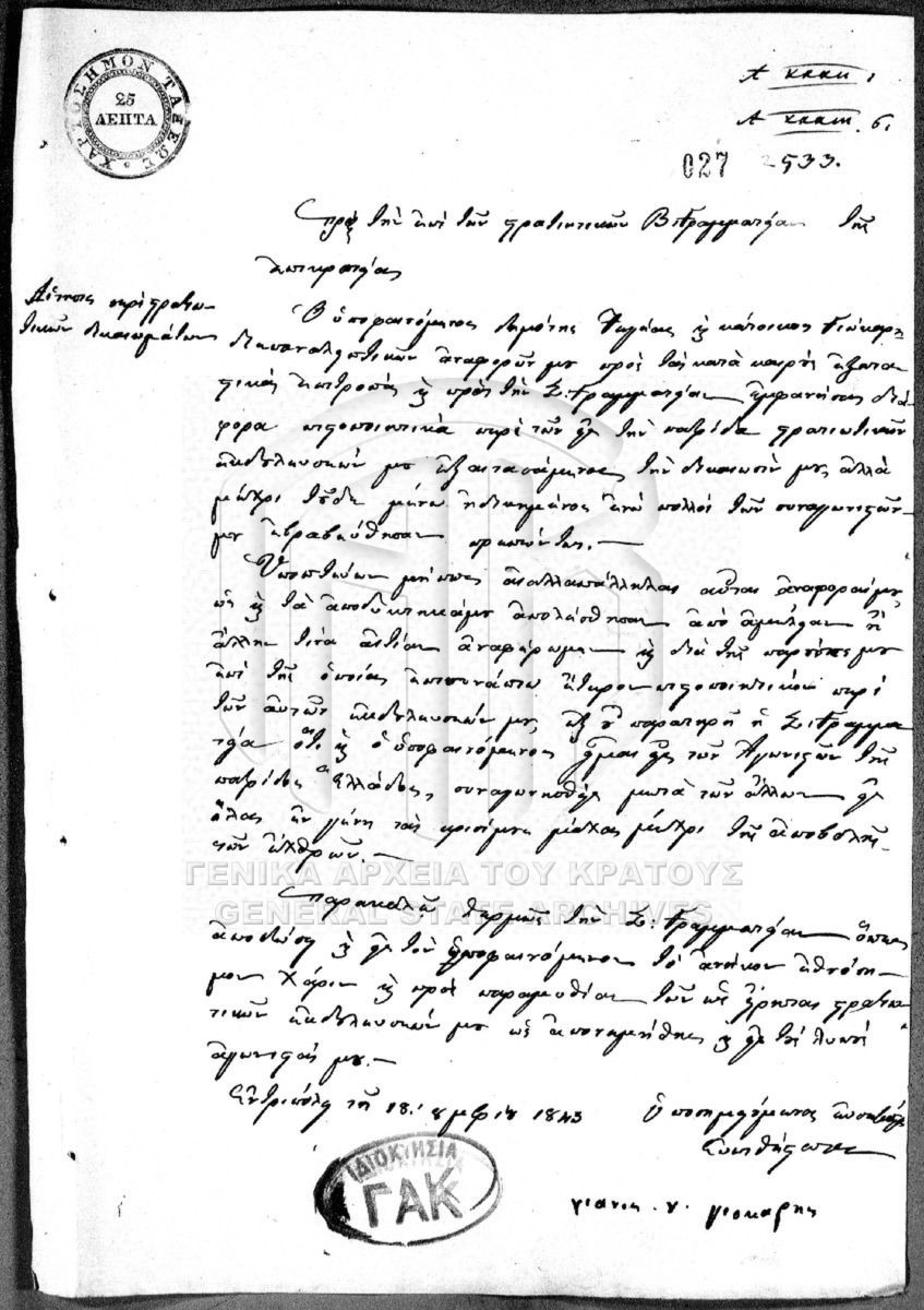 [Fonds] GRGSA-CSA_PAO007.00 Archive of Honorary Awards - Archive of Honorary Awards [1834 - 1865] Το αρχείο αποτελείται από 307 φακέλους ποικίλου όγκου, οι οποίοι φέρουν ταξινομική αρίθμηση κατά χρονολογική σειρά, από 1-307. Αθροιστικά... |