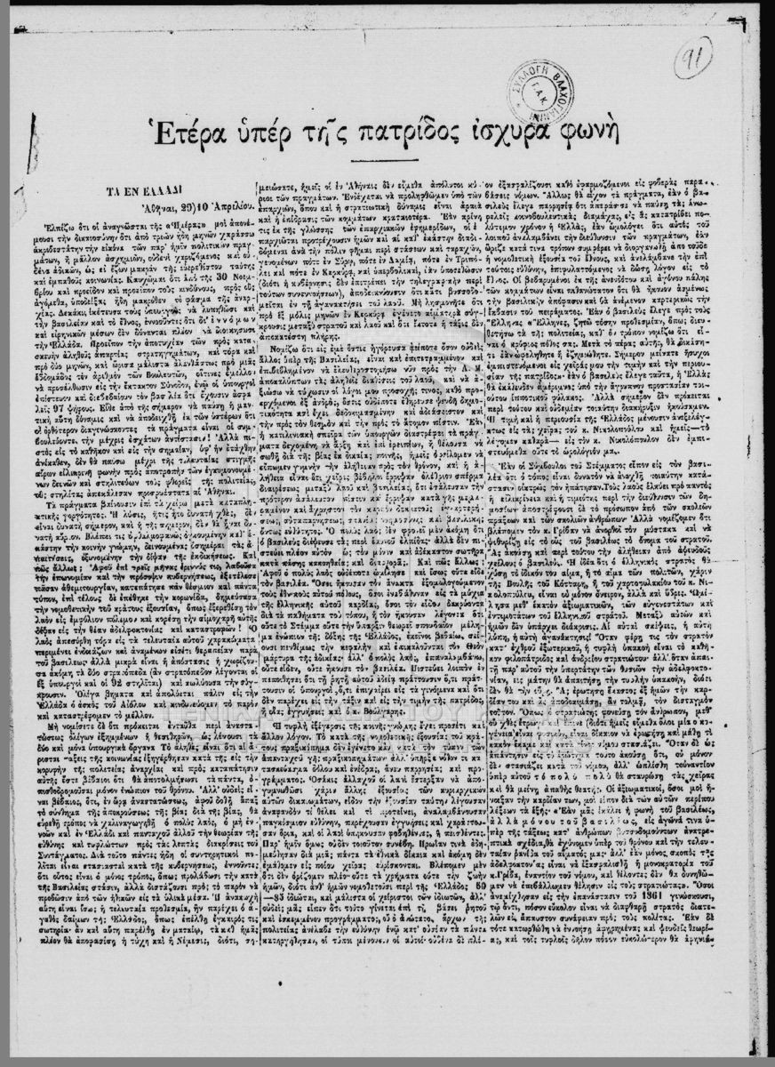 Περιέχει προγράμματα (τελετής δοξολογίας επί τη εορτή του ονόματος του Βασιλέως τη 21 Απριλίου 1865, της τελετής της εθνικής εορτής της 2...