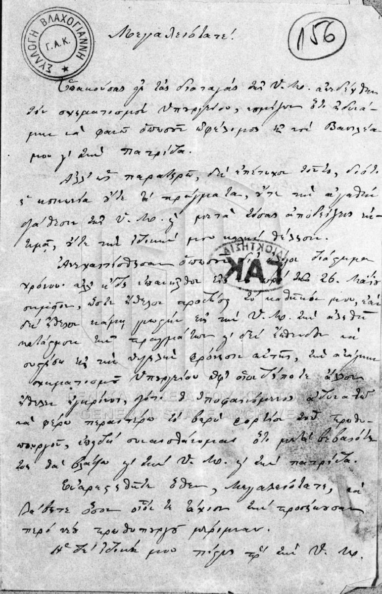 Περιέχει αλληλογραφία του Εκτελεστικού Σώματος και της επί των Στρατιωτικών Γραμματείας της Επικρατείας προς τον Ιωάννη Κολοκοτρώνη και τ...