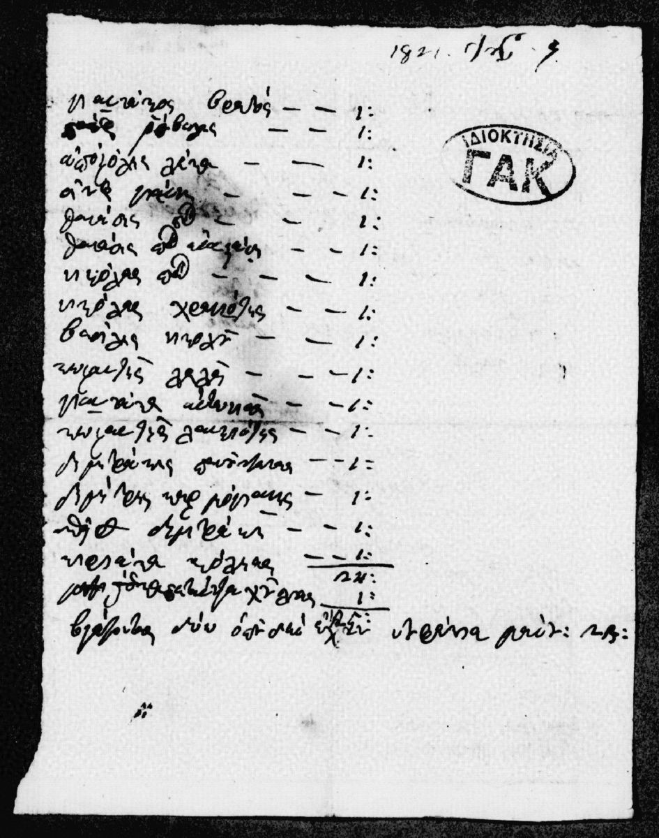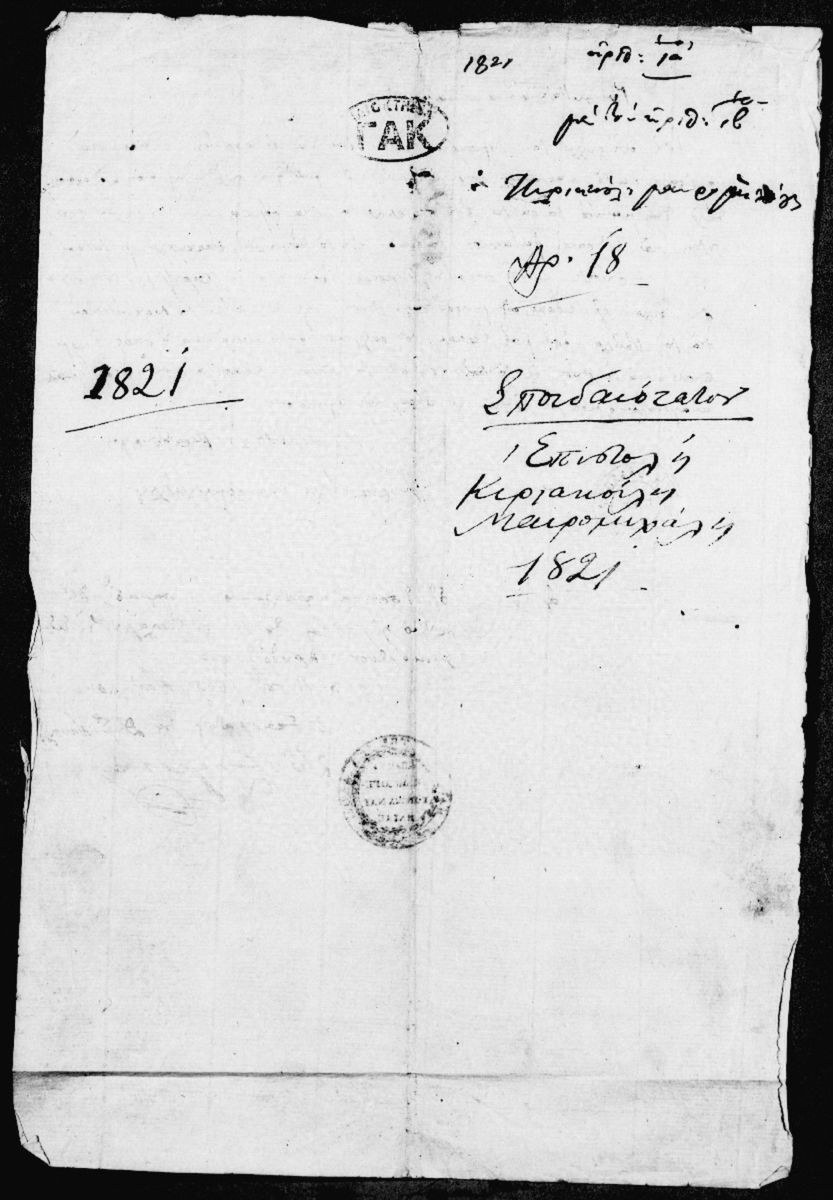 [Φάκελος] GRGSA-CSA_PCVLA.AA.S01.SS05.F000250 Φάκελος #250 - "Αρχείο Ρήγα Παλαμήδη, Επαναστατικά" [1820 – 1821] Περιέχει αλληλογραφία εκ μέρους του φιλογενούς αρχιστράτηγου των Σπαρτιατικών στρατευμάτων Πέτρου Μαυρομιχάλη και της εν Καλαμάτα Μεσσηνι... |