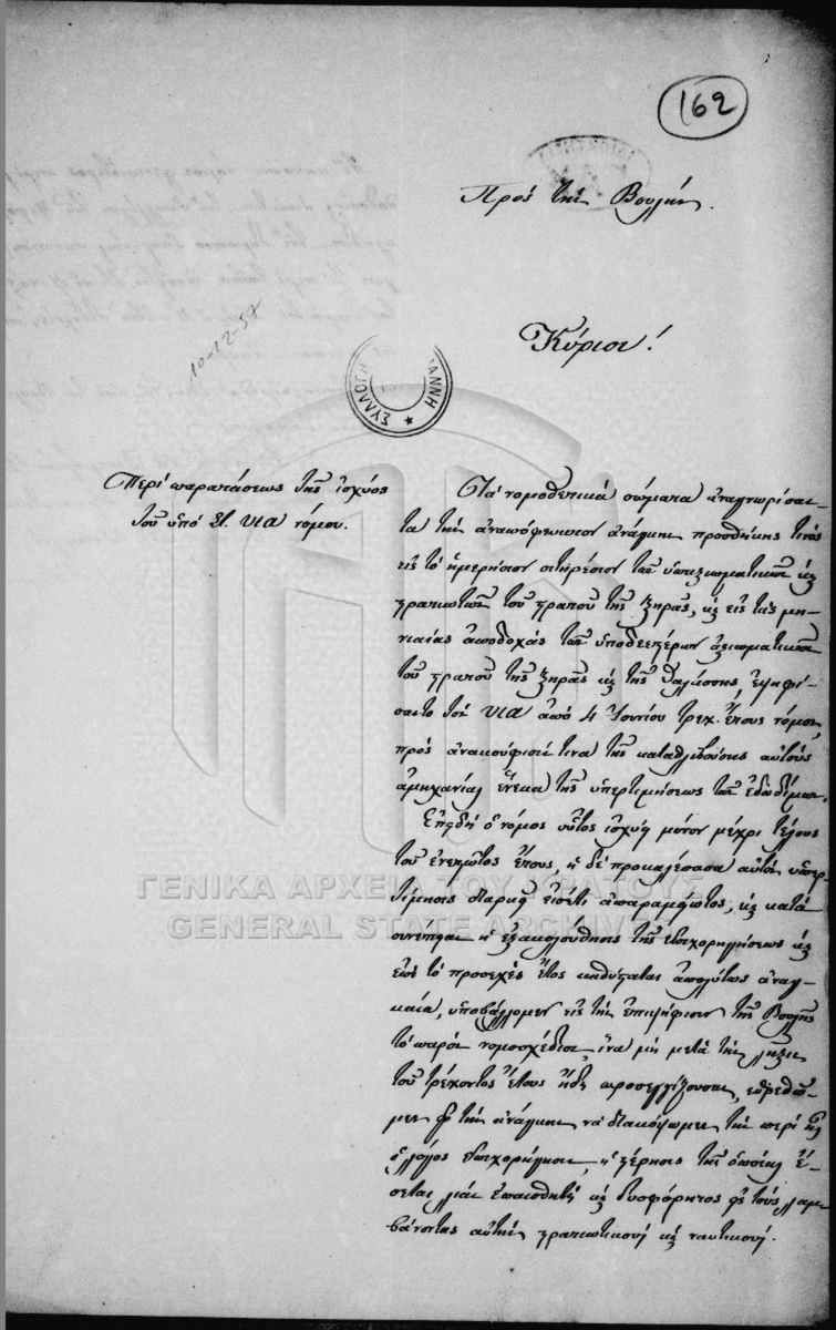 [File] GRGSA-CSA_PCVLA.AA.S01.SS03.F000162 File #162 - "Βουλή και Γερουσία" [1857] Περιέχει αλληλογραφία προς τη Γερουσία και της Εθνικής Τράπεζας της Ελλάδος προς το Προεδρείο της Γερουσίας, του επί των Αυλικών Τελετών ... |