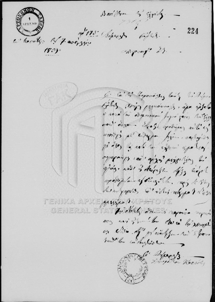 [Item] GRGSA-CSA_PAO007.00.01.F000018.IT000224 Item #224 - Πιστοποιητικά [7 Απριλίου 1839] Πιστοποιητικό υπογεγραμμένο και σφραγισμένο από το Δήμαρχο Γόρτυνας Σπυρίδωνα Καρύδη με το οποίο βεβαιώνεται η συμμετοχή του Χρήστου Γαλα... |
