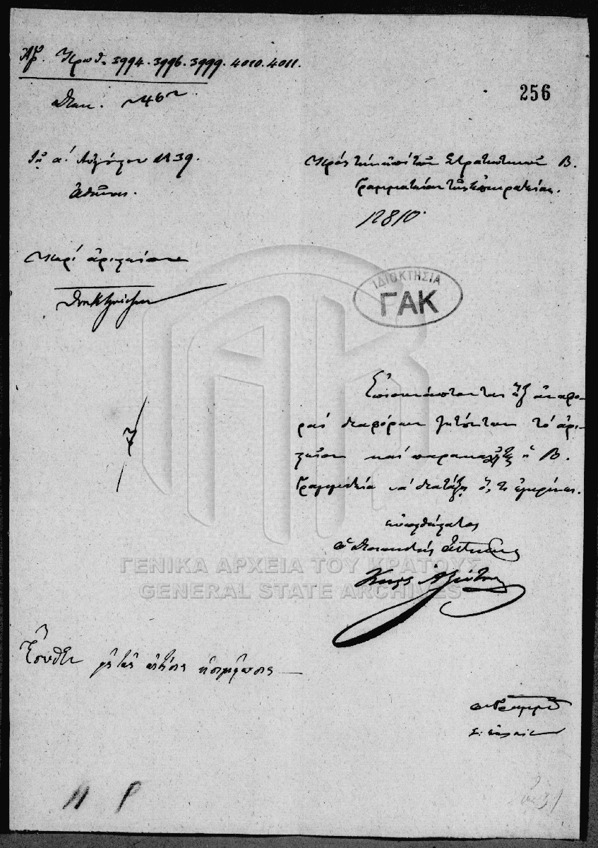 [Pièce] GRGSA-CSA_PAO007.00.01.F000030.IT000256 Pièce #256 - Υπηρεσιακή αλληλογραφία [1 Αυγούστου 1839] Επιστολή του Διοικητή Αττικής προς την επί των Στρατιωτικών Βασιλική Γραμματεία της Επικρατείας με την οποία διαβιβάζονται στην ανωτέρω γ... |