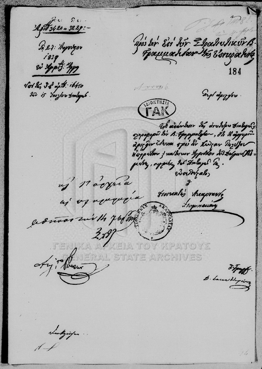 [Item] GRGSA-CSA_PAO007.00.01.F000033.IT000184 Item #184 - Υπηρεσιακή αλληλογραφία [27 Αυγούστου 1839] Επιστολή του διοικητή Ακαρνανίας προς την επί των Στρατιωτικών Γραμματεία της Επικρατείας, στην οποία αναφέρει ότι απένημε το αργυρό αρισ... |