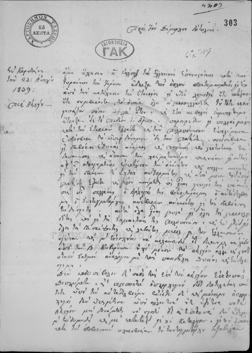 [Τεκμήριο] GRGSA-CSA_PAO007.00.01.F000035.IT000303 Τεκμήριο #303 - Υπηρεσιακή αλληλογραφία [23 Αυγούστου 1839] Επιστολή του Παναγιώτη Βάγη προς το δήμαρχο Αιτωλίας, στην οποία αναφέρει τις υπηρεσίες του στον αγώνα της ανεξαρτησίας. |