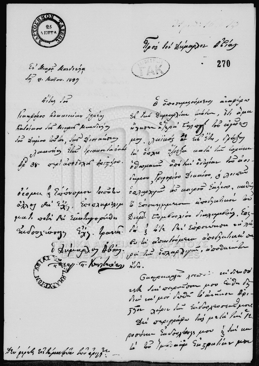 [Τεκμήριο] GRGSA-CSA_PAO007.00.01.F000037.IT000270 Τεκμήριο #270 - Aτομική αίτηση απονομής [3 Μαΐου 1839] Αίτηση απονομής αριστείου του ιερέα Νικηφόρου Κοκκινάκη προς το δήμαρχο Aβίας. |