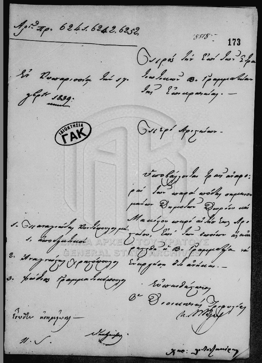 [Item] GRGSA-CSA_PAO007.00.01.F000042.IT000173 Item #173 - Υπηρεσιακή αλληλογραφία [17 Νοεμβρίου 1839] Έγγραφο που αποστέλλει ο Διοικητής Τριφυλίας στην επί των Στρατιωτικών Β. Γραμματεία της Επικρατείας με το οποίο διαβιβάζει τρεις αναφορέ... |