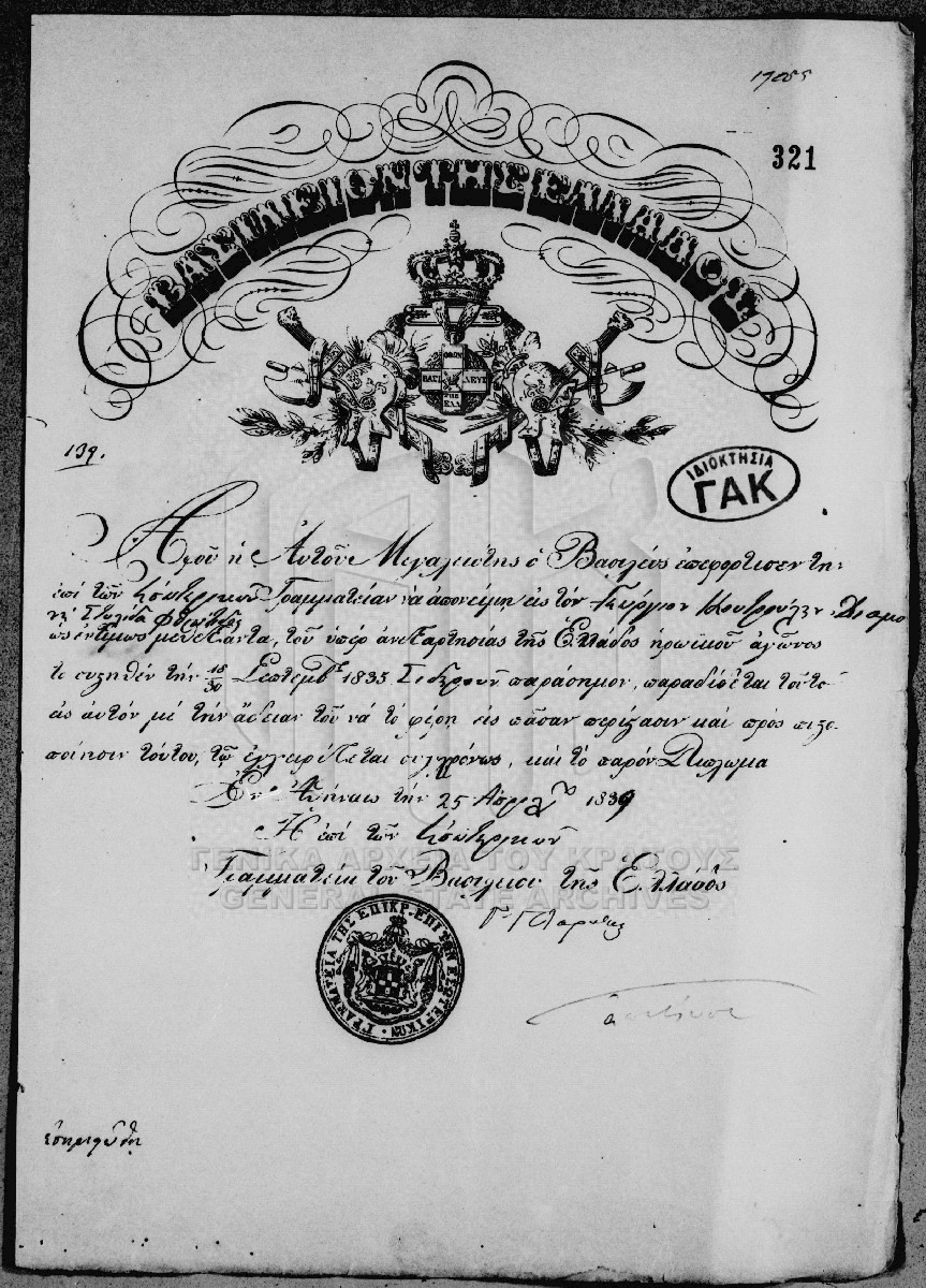 [Item] GRGSA-CSA_PAO007.00.01.F000042.IT000321 Item #321 - Δίπλωμα σιδερένιου αριστείου [25 Απρίλιος 1839] Χορήγηση διπλώματος σιδηρού αριστείου στον Γεώργιο Κουτρούλη για την προσφορά του στον Αγώνα της Ανεξαρτησίας. |