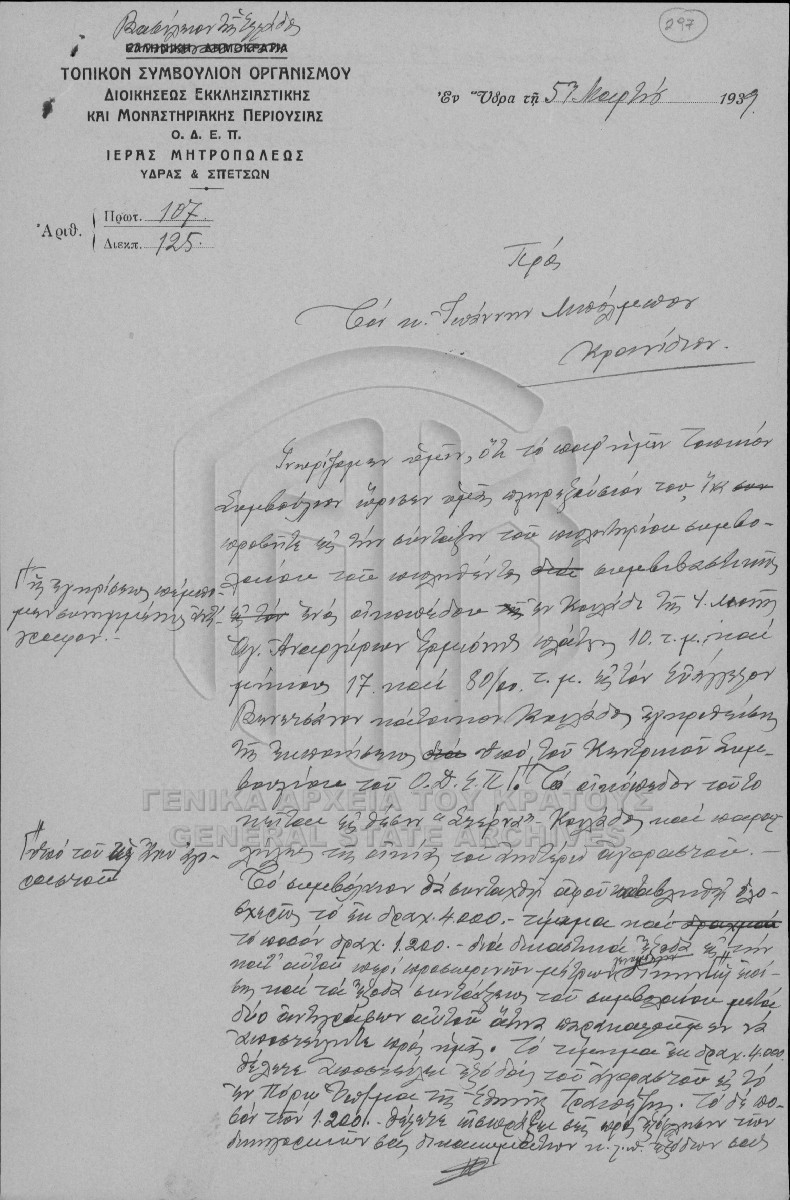 Contents: Αλληλογραφία - οικονομικά έγγραφα Ι.Μ. Ζωοδόχου Πηγής - Καλαβρία - Πόρος. Οικονομικά έγγραφα Ι.Μ. Ζωοδόχου Πηγής Καλαβρί...