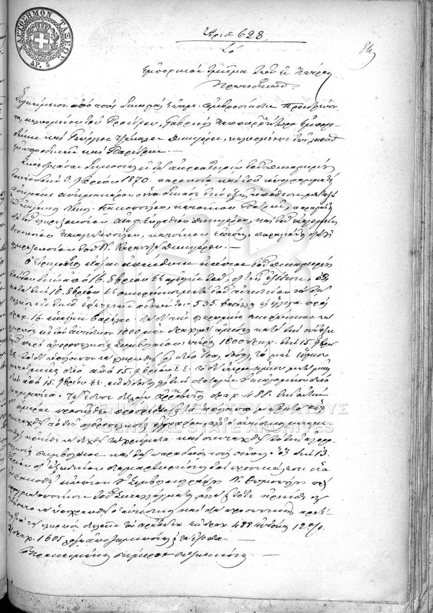 [Subfile] GRGSA-ACH_JUS027.01.F000070.SF0001 Subfile #001 - PATRAS COURT OF FIRST INSTANCE ARCHIVE. COMMERCIAL TRIBUNAL [1870] Court judgements 446 - 656. |